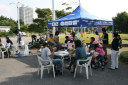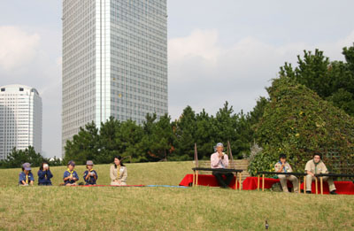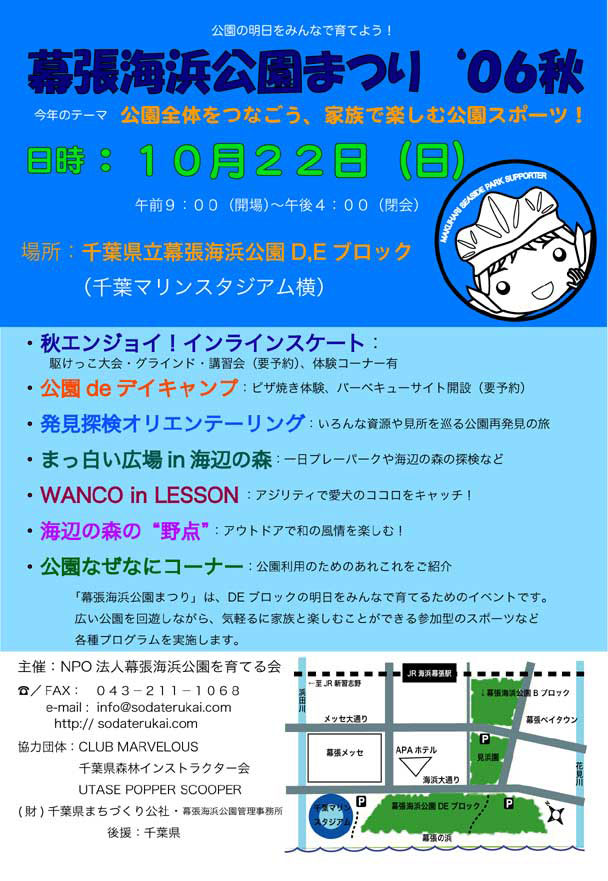 | 幕張海浜公園は、県民参加で公園づくりをすすめている公園です。NPO法人 幕張海浜公園を育てる会は、県主催の県民参加の公園づくりワークショップからはじまり、公園づくりのための活動を行っています。 幕張海浜公園まつりは、公園づくりのために、公園利用者がどんなニーズをもっており、どのようなことを楽しめるのか?そのためになにが必要なのかを、利用実地の中から探していくための場としてはじめました。そして、まつりなどを通して公園利用者がお互いに場所と思いを共有し合いながら、公園づくりをすすめていくための「公園コミュニティ」の場づくりでもあります。 |